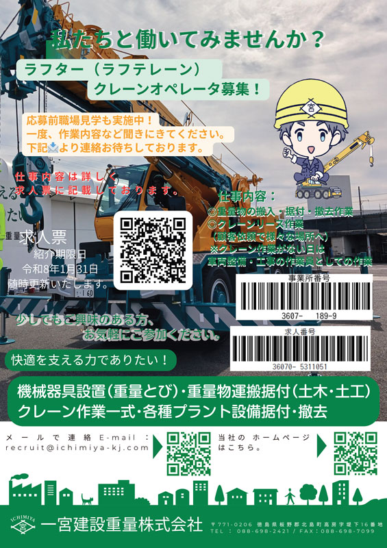 | 仕事内容 | 徳島県内・県外で13t~80tまでのクレーン運転になります。 詳しくはハローワーク求人票を参照ください。 ハローワーク求人票 |