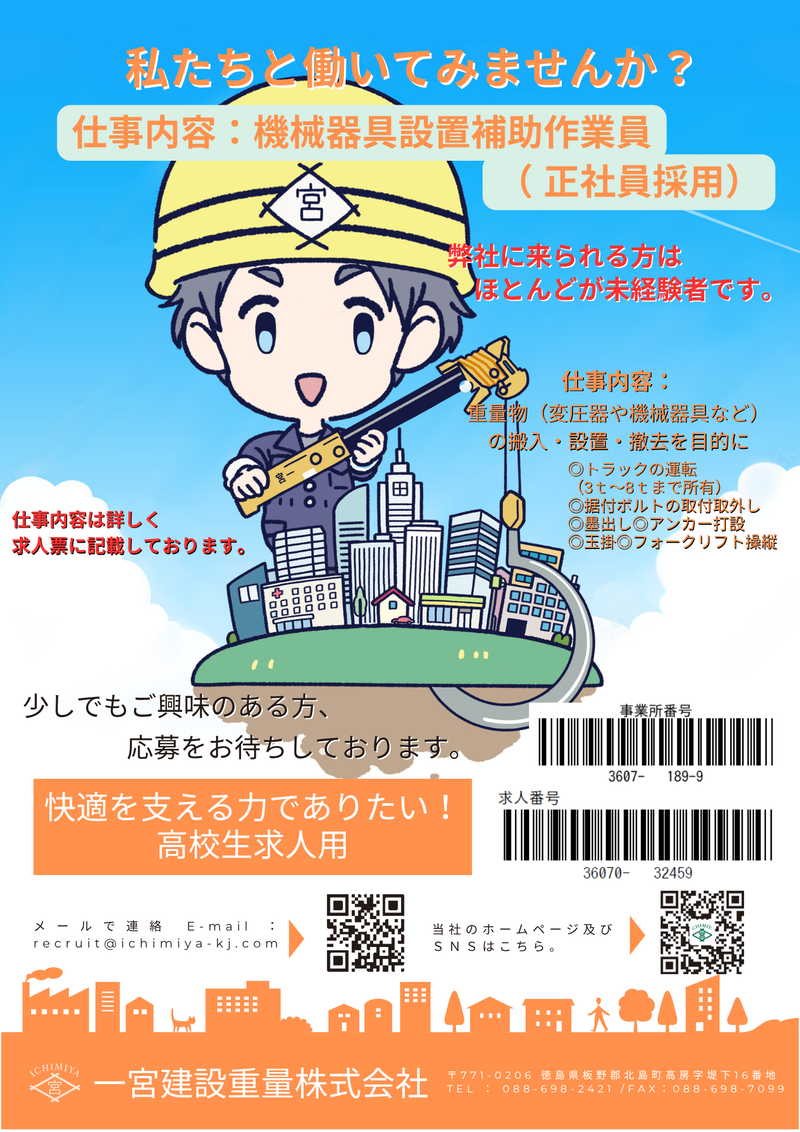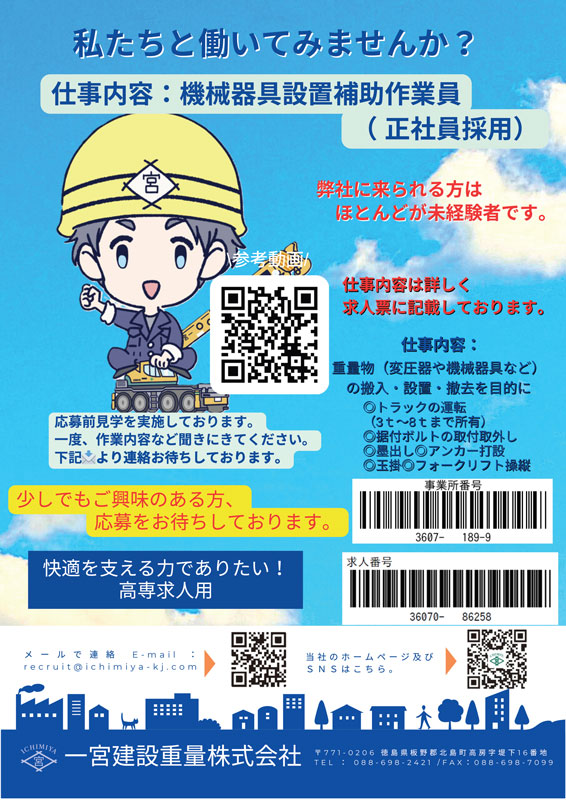 | 仕事内容 | 重量物(変圧器や機会器具など)の搬入・設置・撤去になります。 詳しくはハローワーク求人票を参照ください。 ハローワーク求人票 |